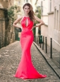 Home >  Prom Dresses >  Elegant Prom Dresses > Exclusive High Neck Coral Red Prom Dress with Brush Train