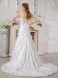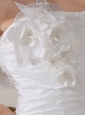 Have you felt a gust of salubrious wind just had passed away beside you? If you are walking among lots of guests in your scared wedding ceremony with this white satin wedding dress, you would give other people this kind of feeling. It features ruched texture throughout with several delicate handed flowers along the bodice side and down from the hips on the opposite side as well as in the back area. A long pleated sweeping with corset-style closure completes the design in encharting look.
