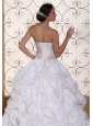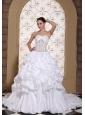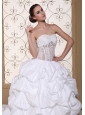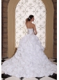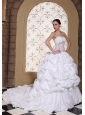 Sweet, romantic dresses never go out of style and are perfect for your wedding. It is characterized by a sweetheart neckline and strapless bodice. Emboridery embellishment on the bodice makes the dress like a flower in full bloom the appliqued lace part on the waist part accents your sexy temperament. Pick-ups on the puffy skirt is splendid. It features a lace-up back. Are you still hesitating? This is a great choice for you. Your memories in this dress will long last.