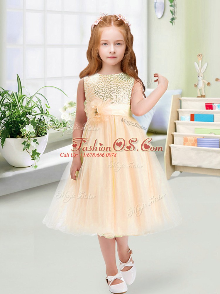 Exquisite Champagne Organza Zipper Scoop Sleeveless Tea Length Flower Girl Dresses for Less Sequins and Hand Made Flower