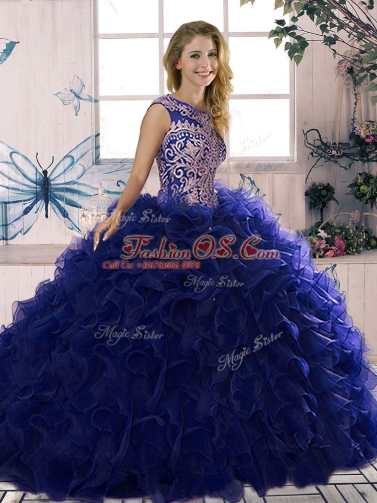 Exquisite Floor Length Lace Up Quince Ball Gowns Purple for Military Ball and Sweet 16 and Quinceanera with Beading and Ruffles