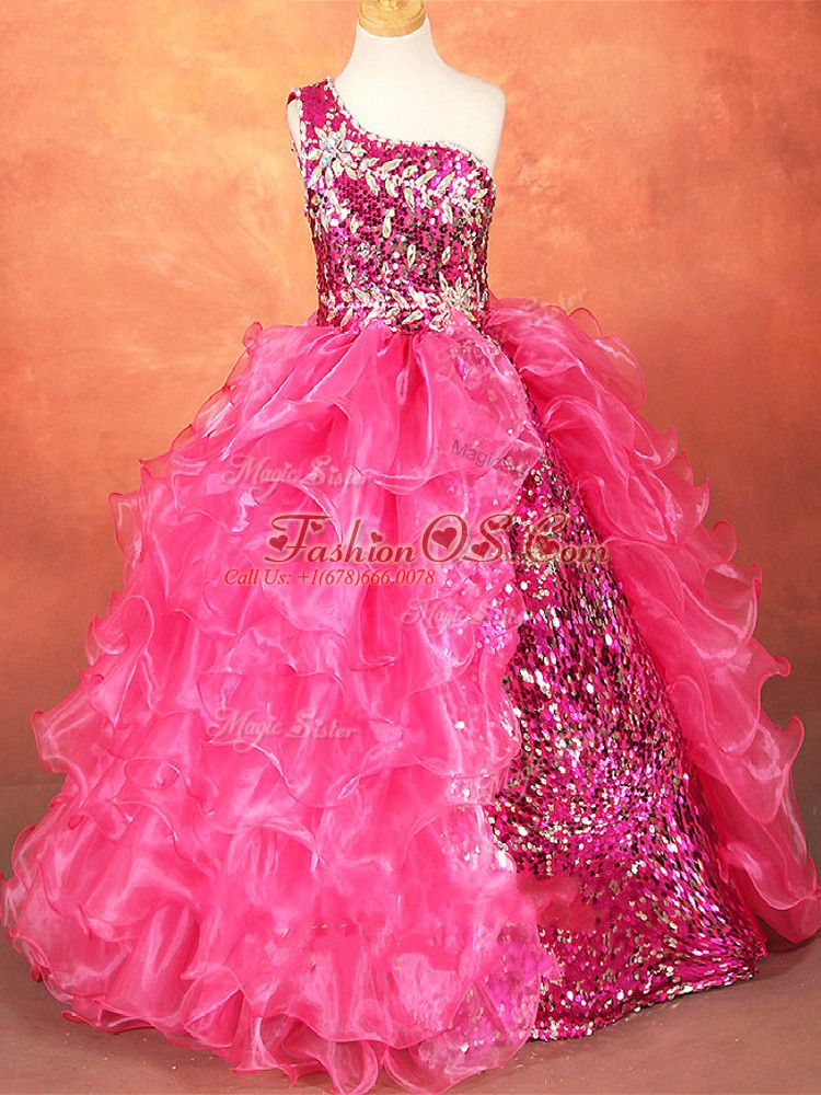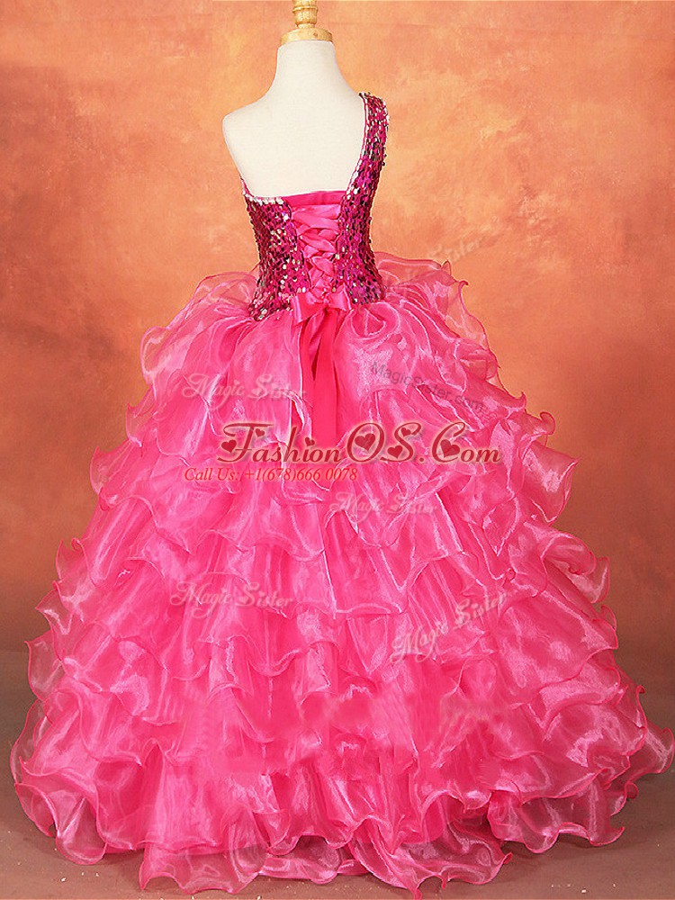 Home >  Special Occasion Dresses >  Mini Quinceanera Dresses > Exquisite Hot Pink Sleeveless Organza Lace Up Kids Pageant Dress for Wedding Party
