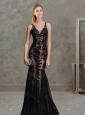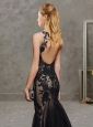 Exquisite Laced Open Back Black Evening Dress with Deep V Neckline
