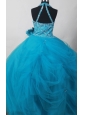 Every girl dreams to be a princess and in this gorgeous gown they will be! The halter ball gown is stunning with beaded bodice and straps. A flower on the side waist specialize the style. Puffy skirt accented by pick ups completes the look.
