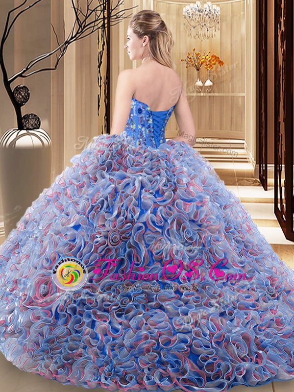 Exquisite Multi-color Fabric With Rolling Flowers Lace Up Sweetheart Sleeveless With Train Quinceanera Gowns Brush Train Embroidery and Ruffles