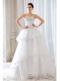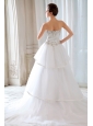 Compliment your natural beauty in graceful wedding gown. The strapless neckline frames the lovely lines of bare shoulders, and careful couture kisses bust, waist and hips. Airy appliques encrusted with beads add delicate accents. The ruched details on the bodice create a flattering silhouette.Filmy tiers of norrow ribbon-trimmed ruffles flutter to full-length.The lace up back finishes the look. Sassy and flowy.