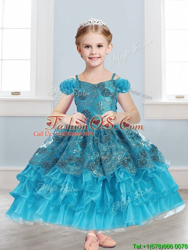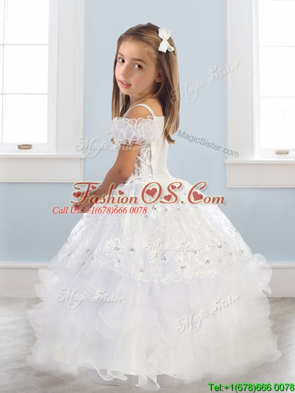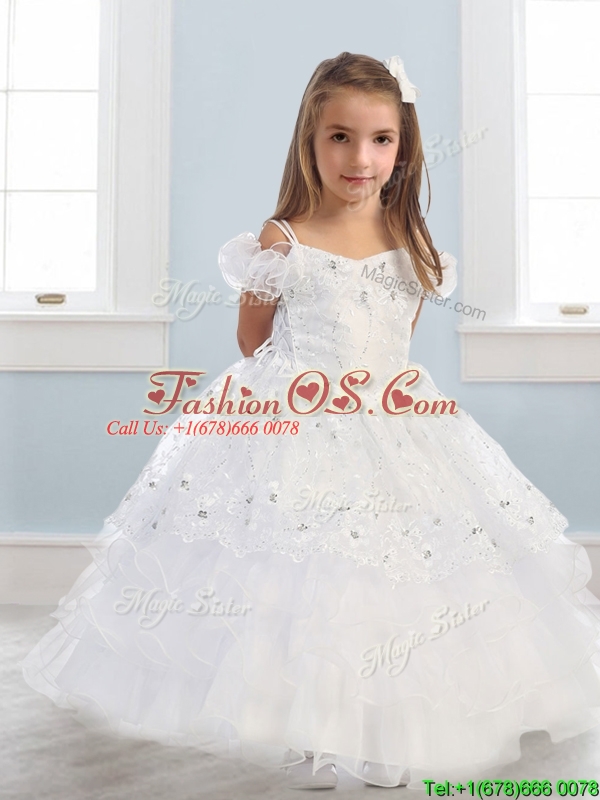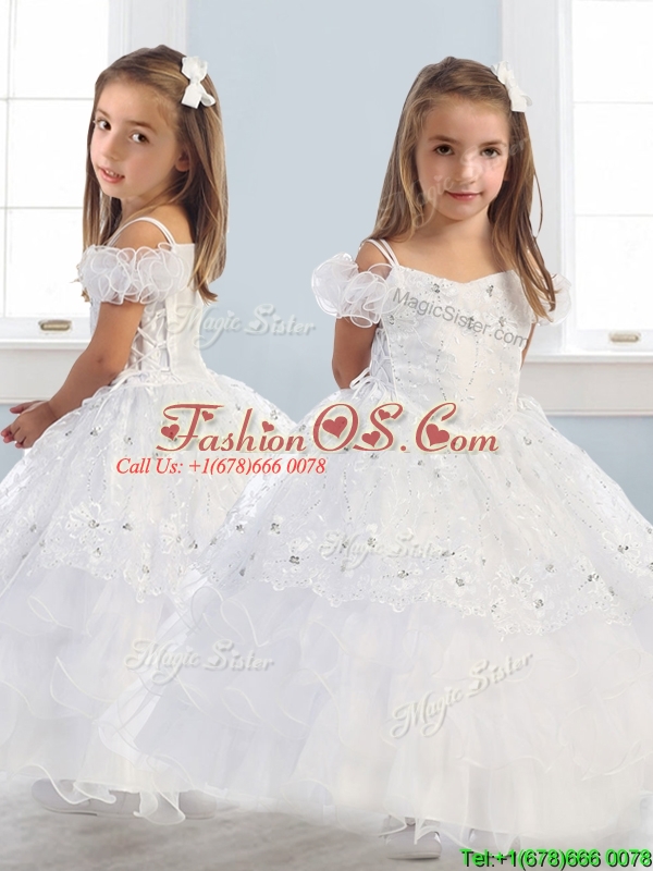 Home >  Special Occasion Dresses >  New Style Little Girl Pageant Dresses > Exquisite Spaghetti Straps Cap Sleeves Little Girl Pageant Dress with Lace and Ruffled Layers