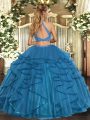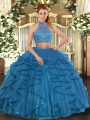 Exquisite Tulle Halter Top Sleeveless Criss Cross Beading and Ruffled Layers Vestidos de Quinceanera in Teal