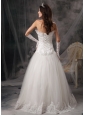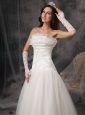 Charming and sweet, this elegant wedding gown is simply stunning. The strapless bodice is delicately pleated and fitted to the hip to showcase your figure. The full-length, A-line skirt falls to the floor and is hemmed in fine lace. If you're determined to make a lasting impression on the most important day of your life, try this wedding dress!