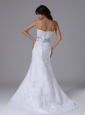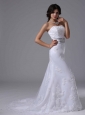 A stunning fit-and-flare silhouette tailored to figure-flattering perfection in a gorgeous lace. The strapless wedding dress features a modest straight neckline and a pretty and wide waistband accentuates your slim waist. An elegant train cascades to the floor.