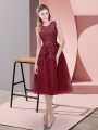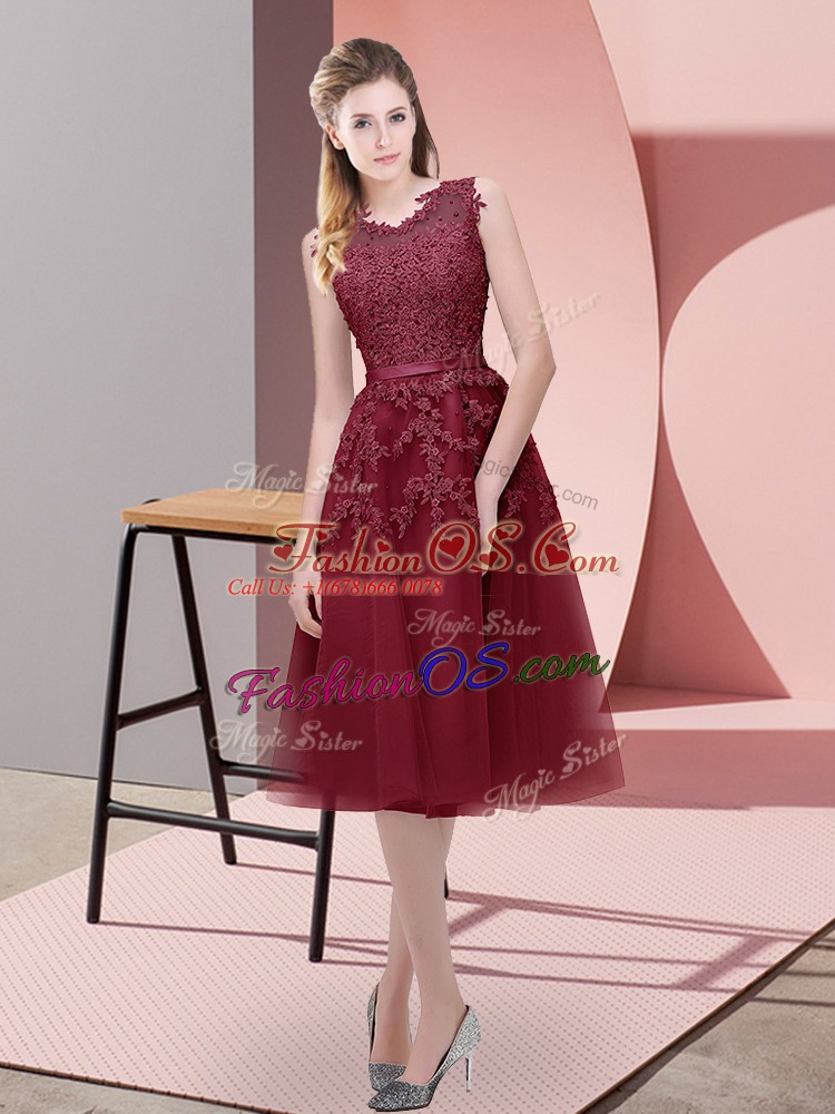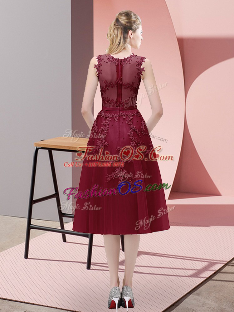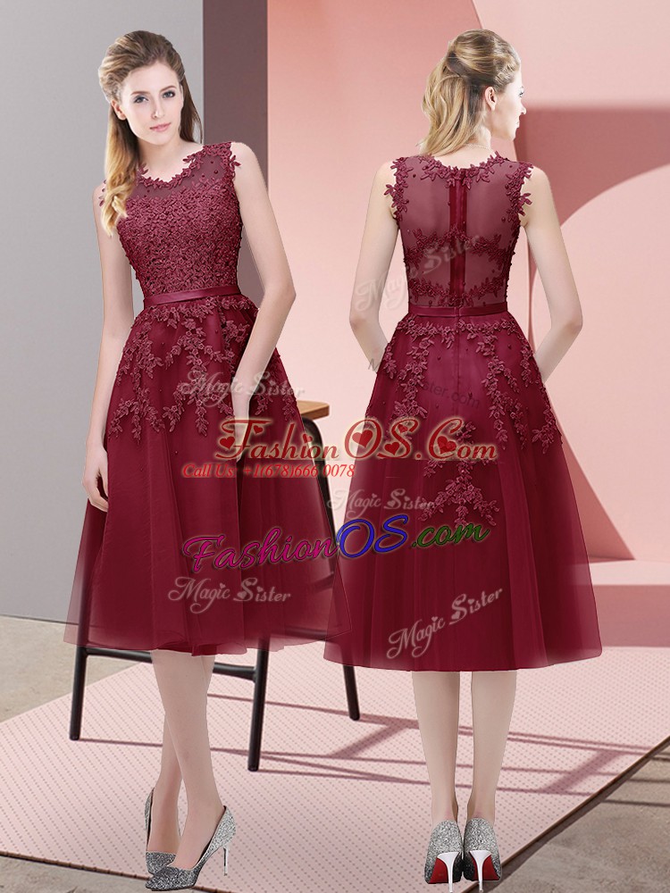 Extravagant A-line Prom Party Dress Burgundy V-neck Tulle Sleeveless Tea Length Lace Up