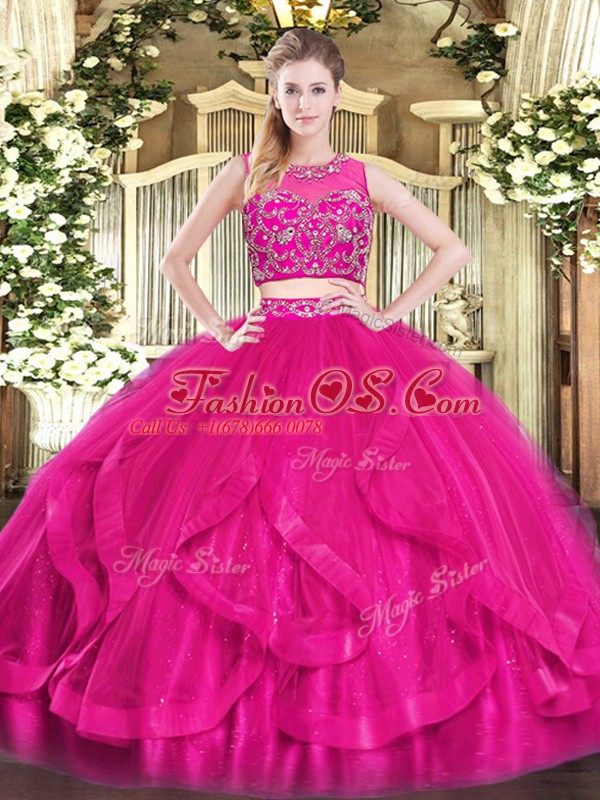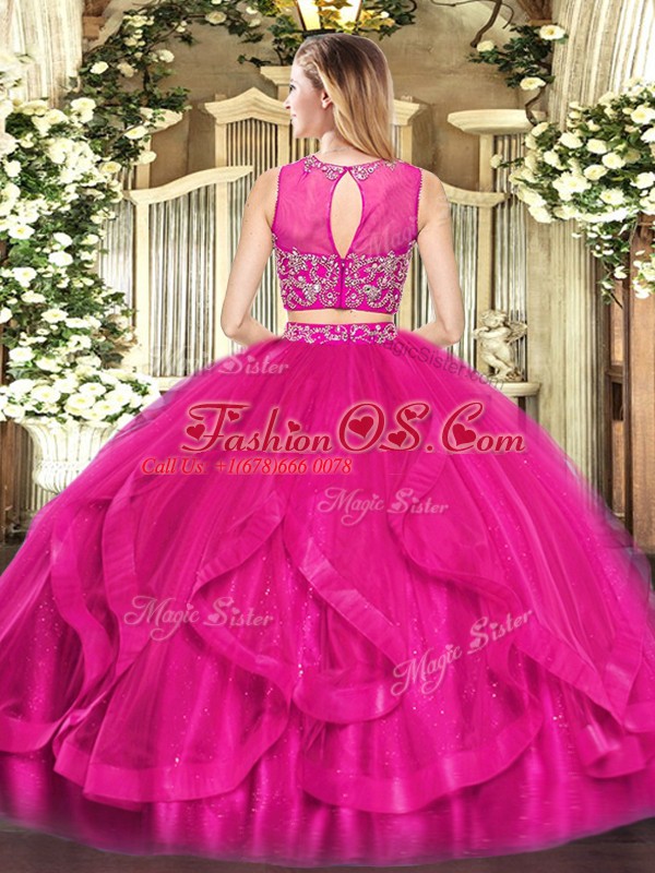 Extravagant Floor Length Hot Pink Sweet 16 Dress Tulle Sleeveless Beading and Ruffles
