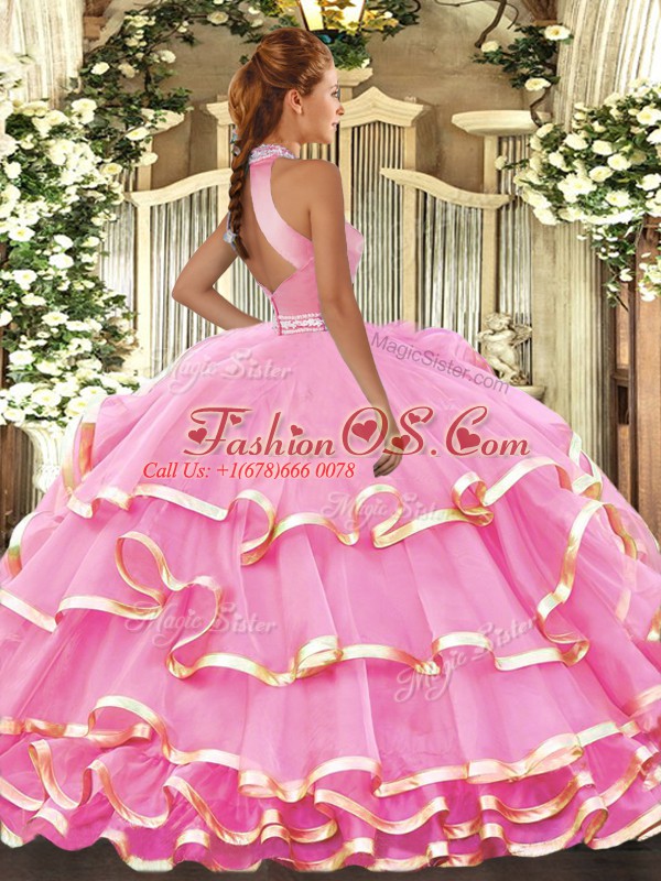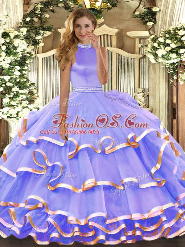 Extravagant Lavender 15 Quinceanera Dress Military Ball and Sweet 16 and Quinceanera with Beading and Ruffled Layers Halter Top Sleeveless Backless