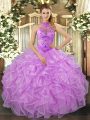 Extravagant Organza Halter Top Sleeveless Lace Up Beading and Ruffles Sweet 16 Quinceanera Dress in Lavender