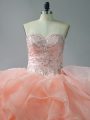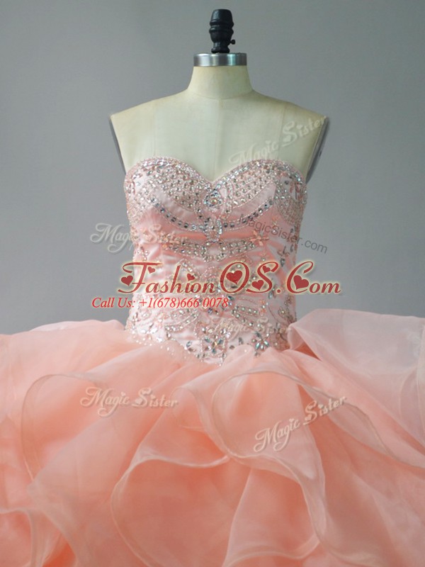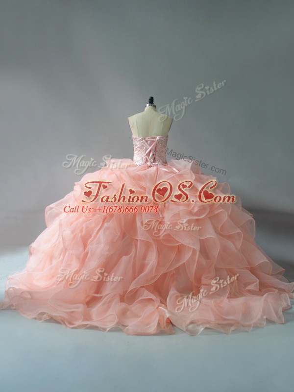 Extravagant Peach Ball Gowns Beading and Ruffles 15th Birthday Dress Lace Up Organza Sleeveless