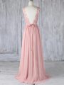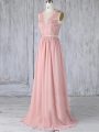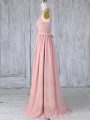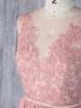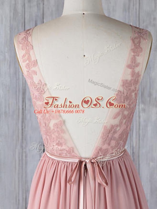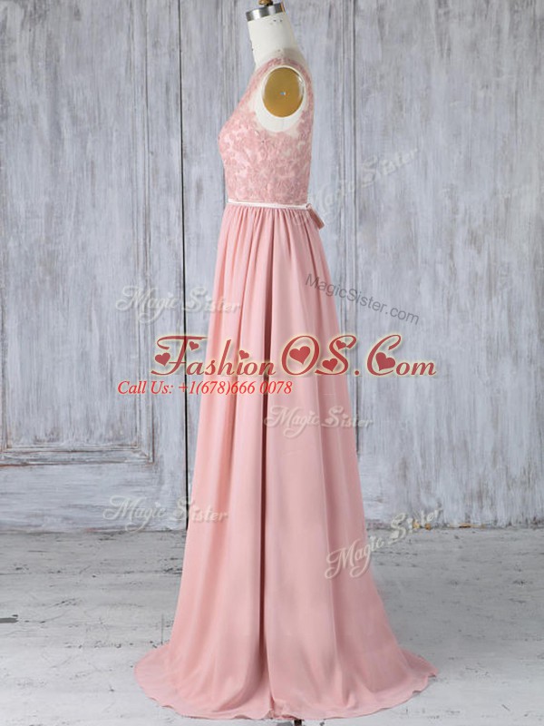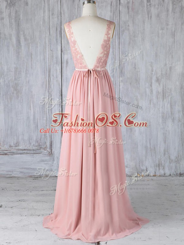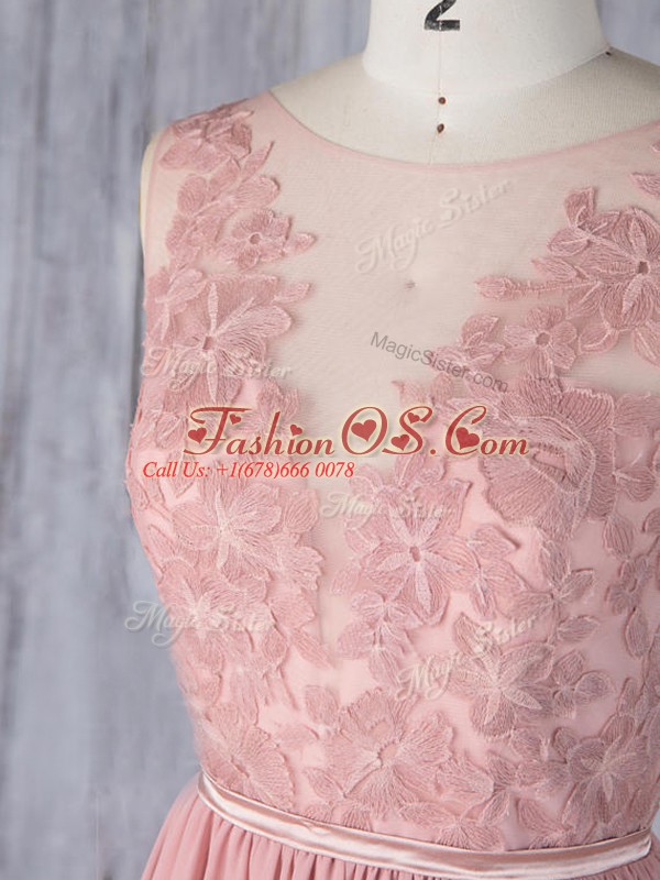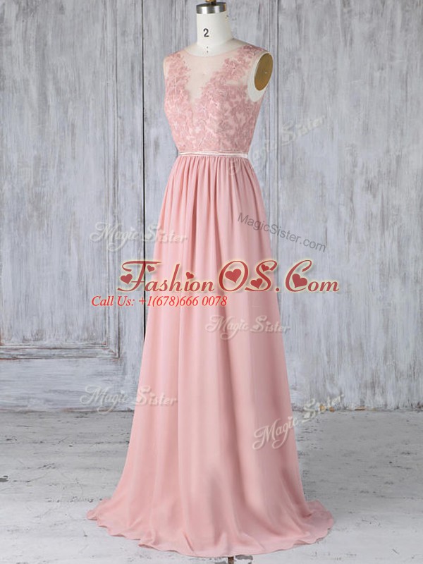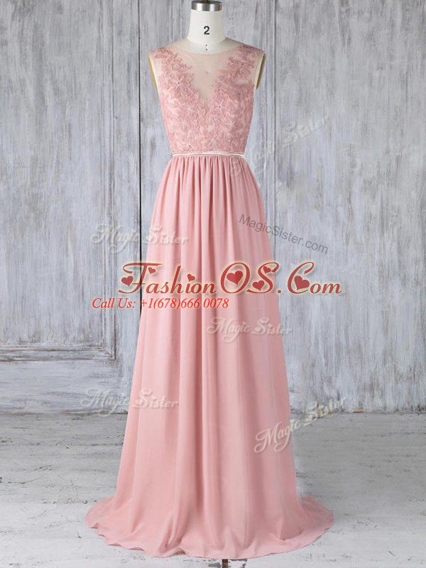 Extravagant Scoop Sleeveless Bridesmaids Dress Sweep Train Appliques Pink Chiffon