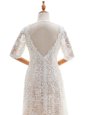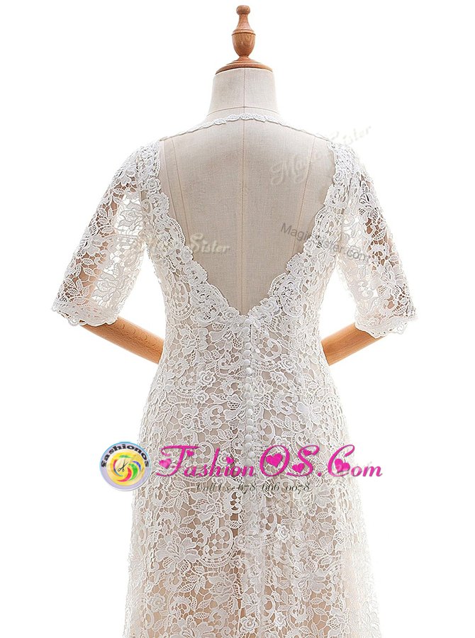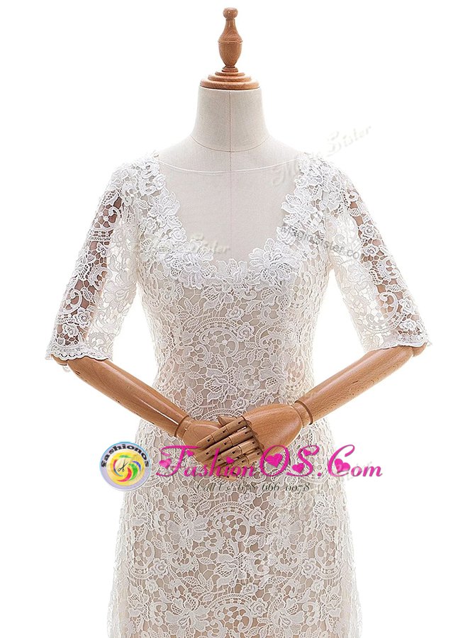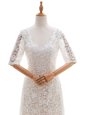 Extravagant White Scoop Neckline Lace Wedding Dress Half Sleeves Clasp Handle