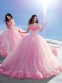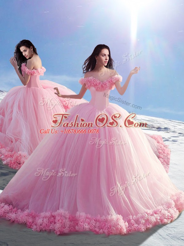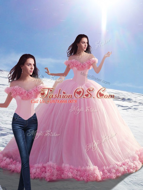 Eye-catching Baby Pink Sleeveless Brush Train Hand Made Flower Sweet 16 Dresses