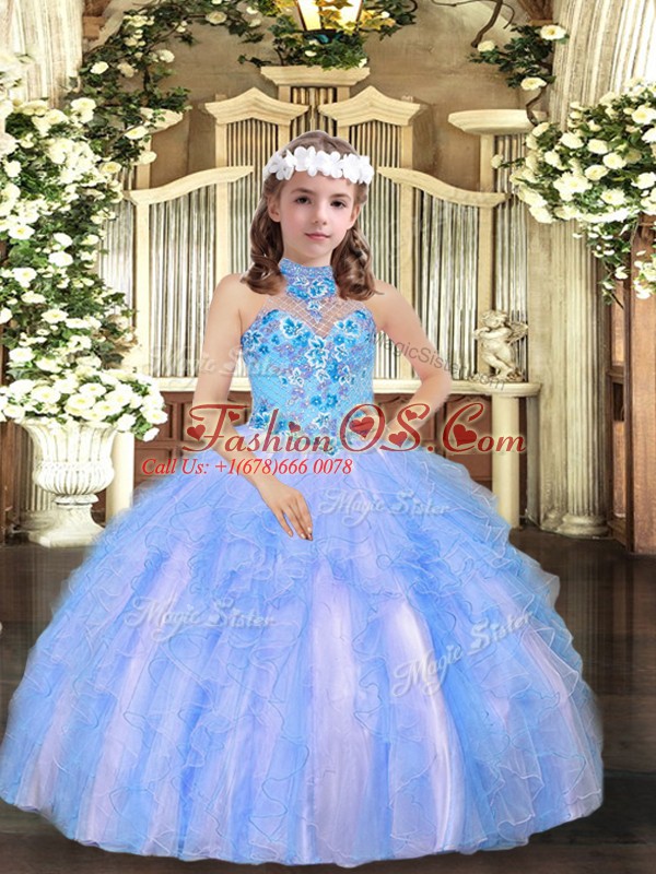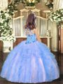 Eye-catching Floor Length Lace Up Little Girl Pageant Gowns Blue for Party and Wedding Party with Appliques and Ruffles