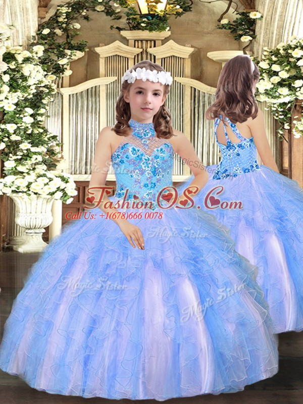 Home >  Special Occasion Dresses >  2018 Little Girl Pageant Dresses > Eye-catching Floor Length Lace Up Little Girl Pageant Gowns Blue for Party and Wedding Party with Appliques and Ruffles