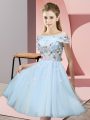 Eye-catching Light Blue Empire Tulle Off The Shoulder Short Sleeves Appliques Knee Length Lace Up Bridesmaid Dress
