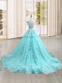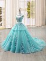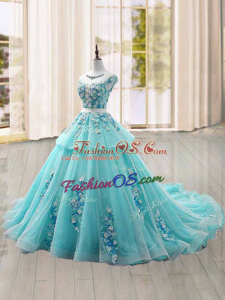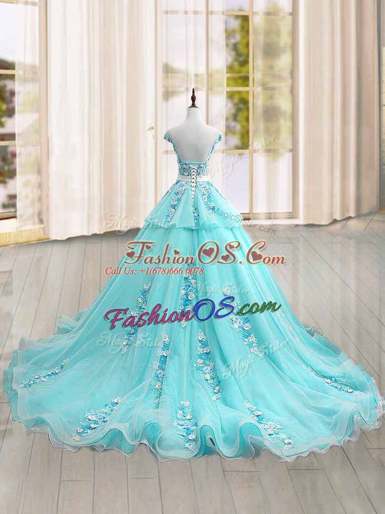 Eye-catching Scoop Cap Sleeves Tulle Quinceanera Dress Appliques Brush Train Lace Up