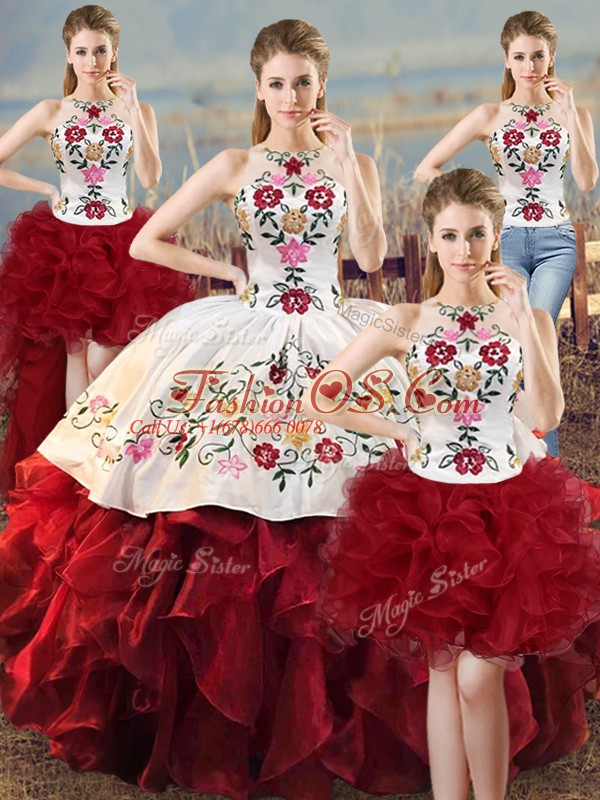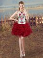 Eye-catching White And Red Halter Top Neckline Embroidery and Ruffles Quince Ball Gowns Sleeveless Lace Up