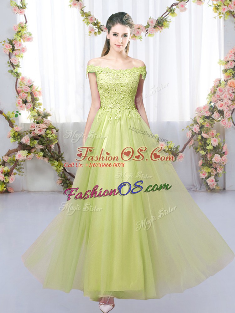 Eye-catching Yellow Green Tulle Lace Up Off The Shoulder Sleeveless Floor Length Bridesmaids Dress Lace