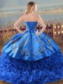 Fabric With Rolling Flowers Sleeveless Quinceanera Gown Brush Train and Embroidery and Ruffles