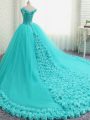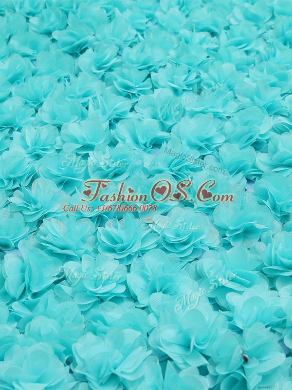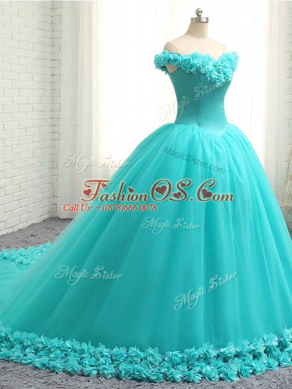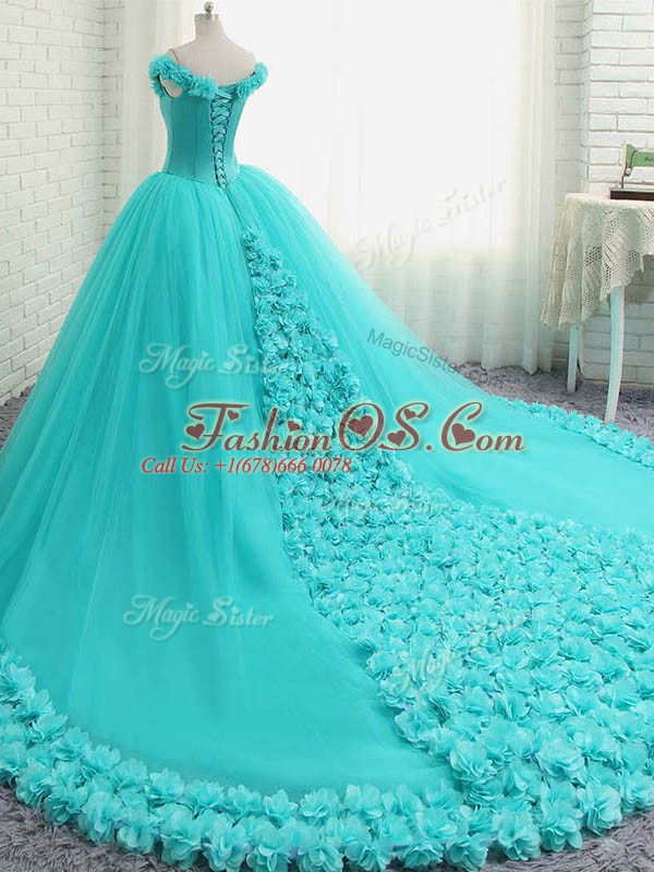 Fabulous Aqua Blue Sweet 16 Dress Military Ball and Sweet 16 and Quinceanera with Hand Made Flower Off The Shoulder Sleeveless Court Train Lace Up