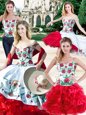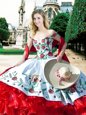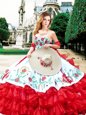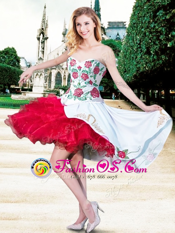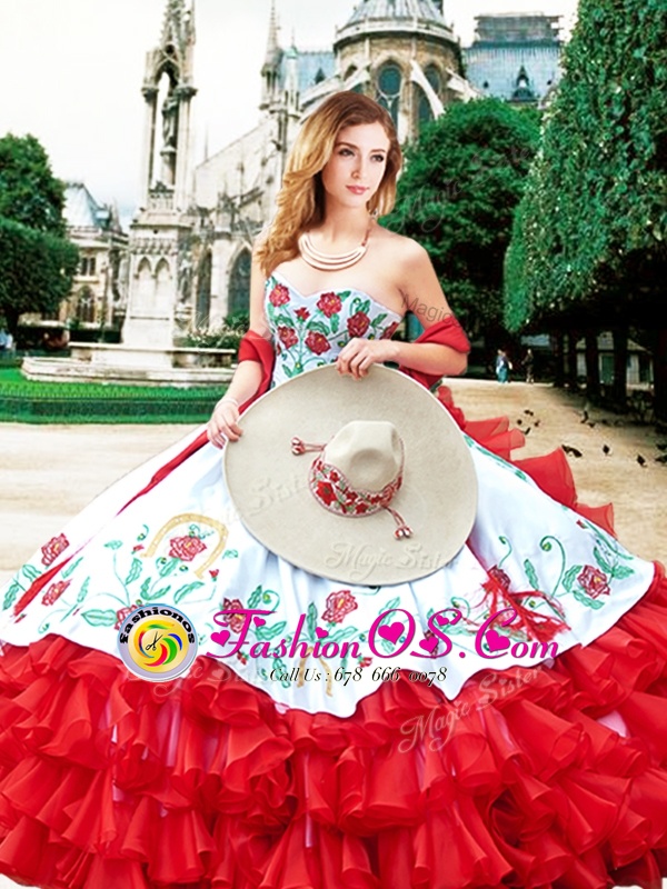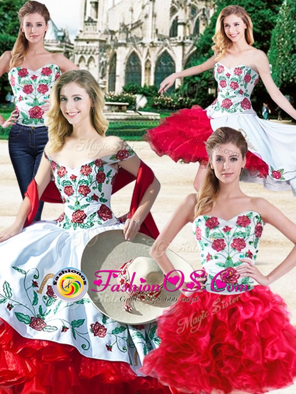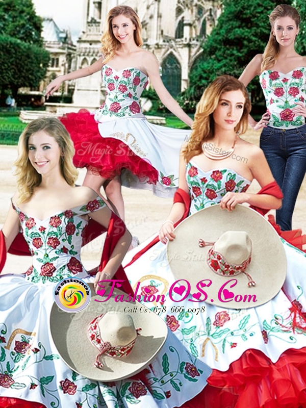 Fabulous Four Piece White And Red Sleeveless Floor Length Embroidery and Ruffles Lace Up Ball Gown Prom Dress