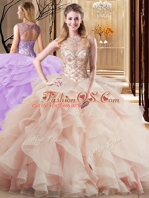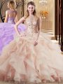 Fabulous Peach Quinceanera Dresses Tulle Brush Train Sleeveless Beading and Ruffles