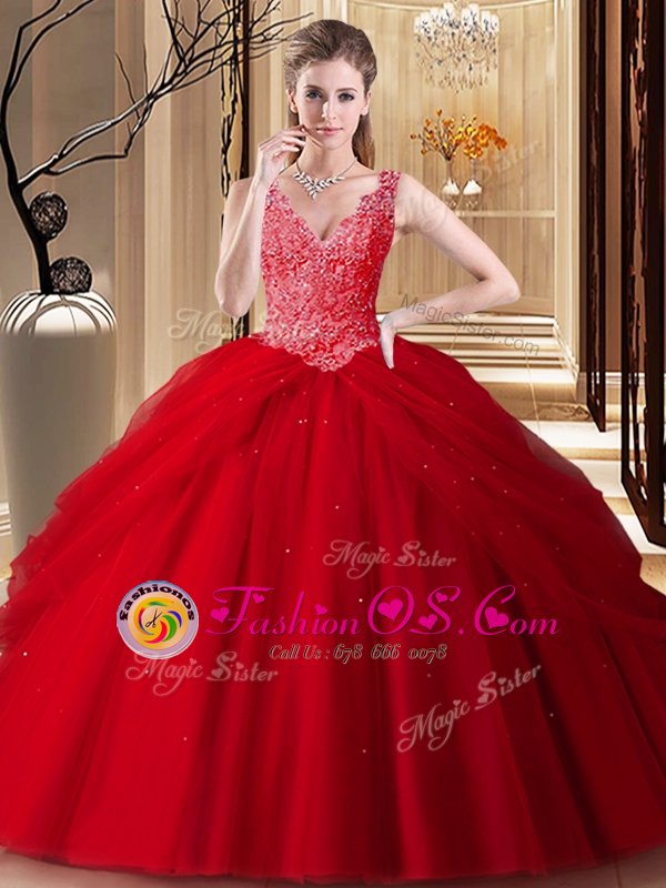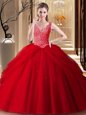 Fabulous Pick Ups V-neck Sleeveless Backless Vestidos de Quinceanera Red Tulle