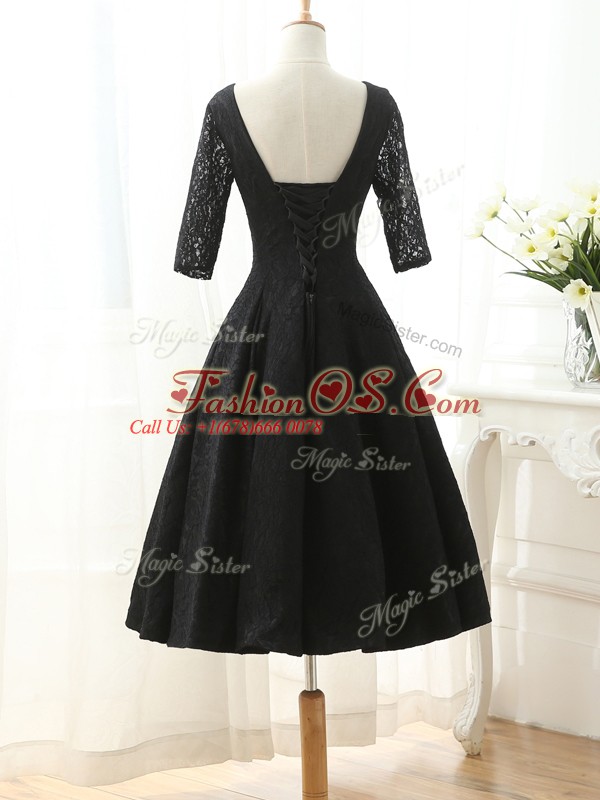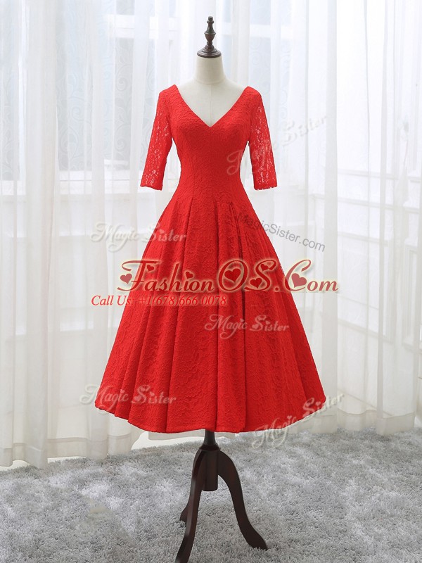 Fabulous Red A-line V-neck Half Sleeves Lace Tea Length Lace Up Lace and Appliques Evening Dress