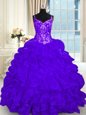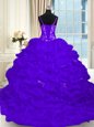 Fabulous Sleeveless Organza Brush Train Lace Up 15 Quinceanera Dress in Purple for with Beading and Embroidery and Ruffles and Pick Ups