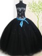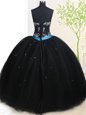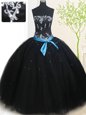 Fancy Black Ball Gowns Beading and Belt Quinceanera Gown Lace Up Tulle Sleeveless Floor Length