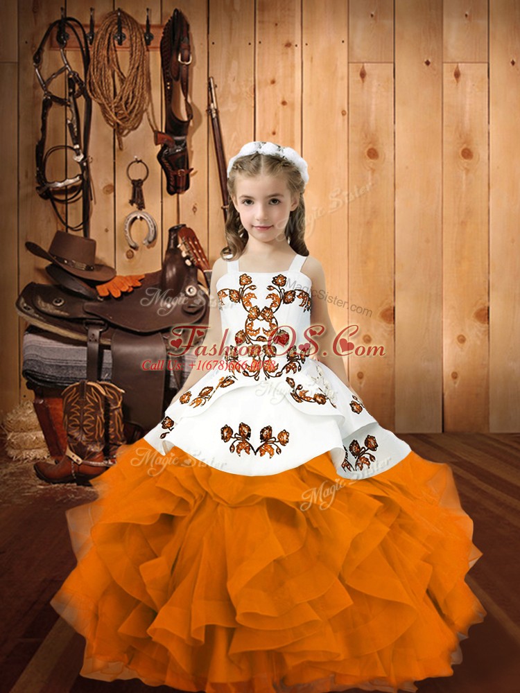 Fancy Embroidery and Ruffles Girls Pageant Dresses Orange Lace Up Sleeveless Floor Length