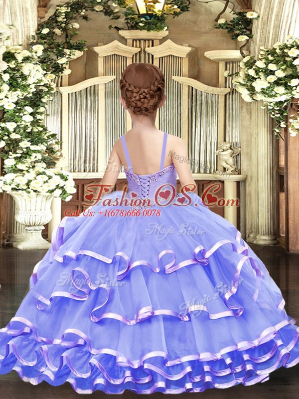 Fancy Floor Length Lilac Pageant Gowns For Girls Organza Sleeveless Beading and Ruffled Layers