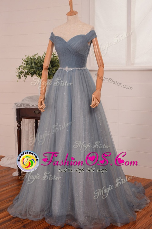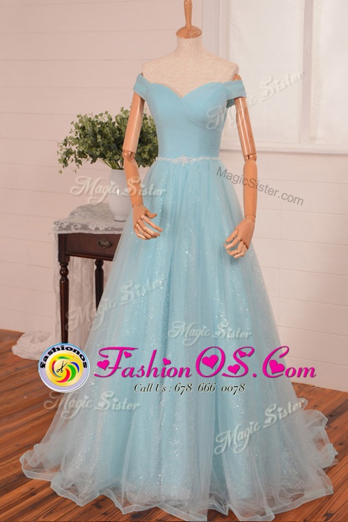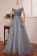 Fancy Off the Shoulder Sleeveless Organza With Brush Train Zipper Dress for Prom in Navy Blue for with Belt