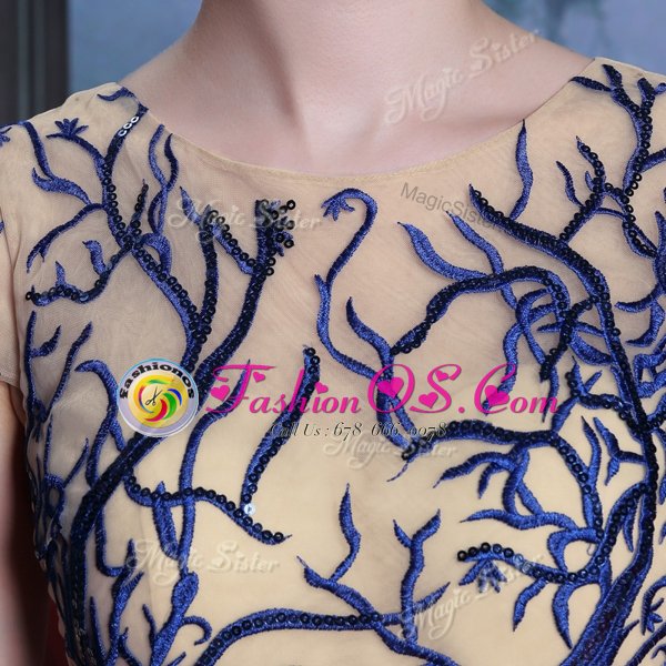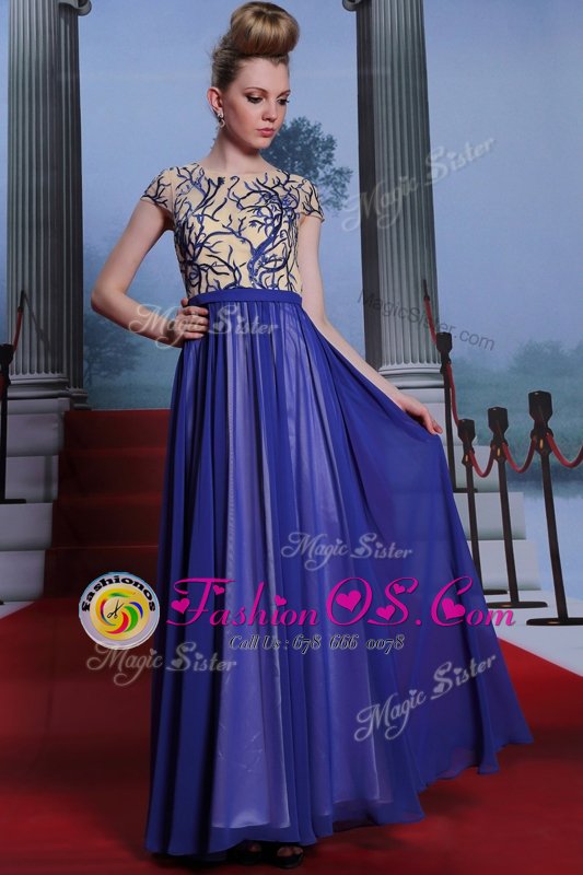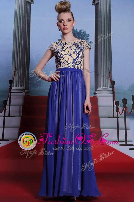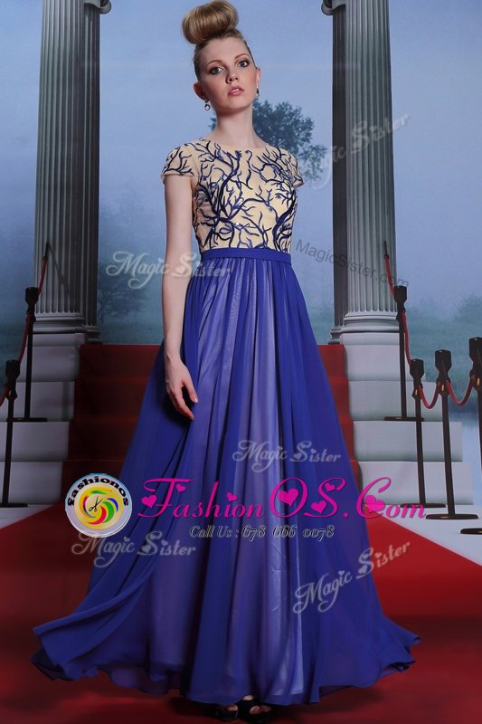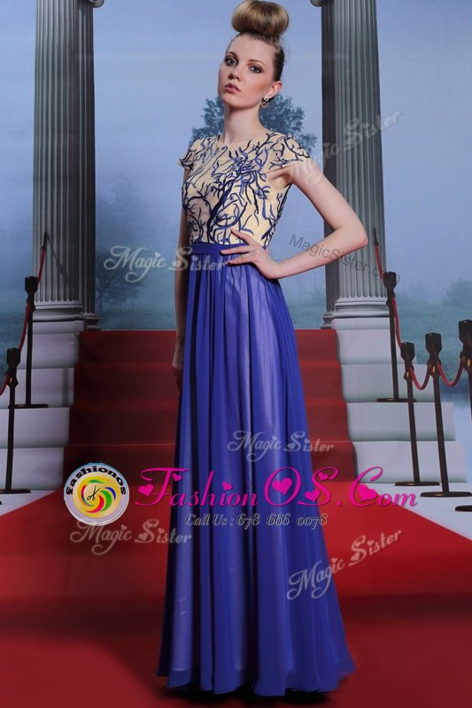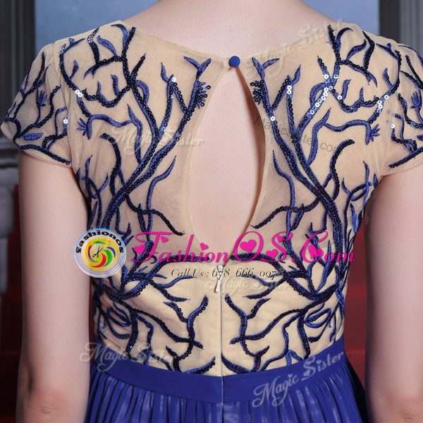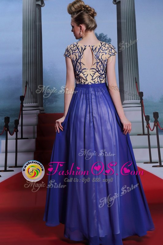 Home >  Prom Dresses >  Perfect Prom Dresses > Fancy Scoop Cap Sleeves Evening Dress Floor Length Embroidery and Sequins Royal Blue Chiffon