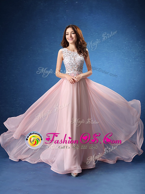 Home >  Special Occasion Dresses >  Celebrity Dresses > Fancy Scoop Lace and Appliques and Belt Dress Like A Star Baby Pink Zipper Sleeveless With Brush Train