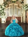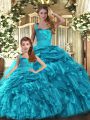 Fancy Teal Ball Gowns Halter Top Sleeveless Organza Floor Length Lace Up Ruffles and Pick Ups Quinceanera Gowns