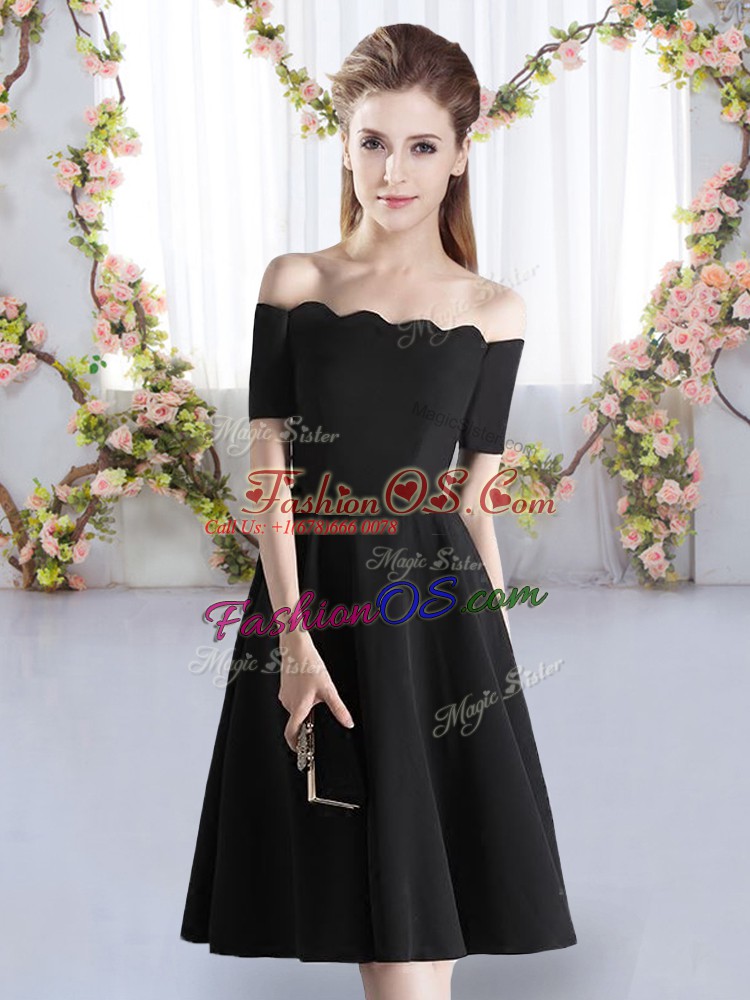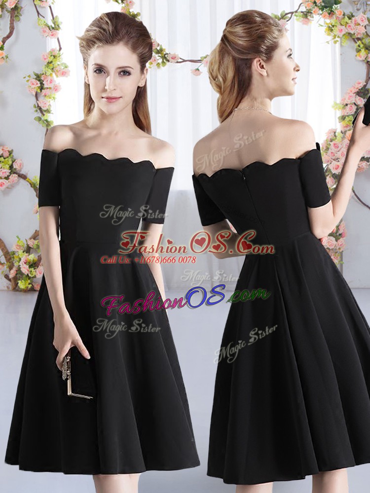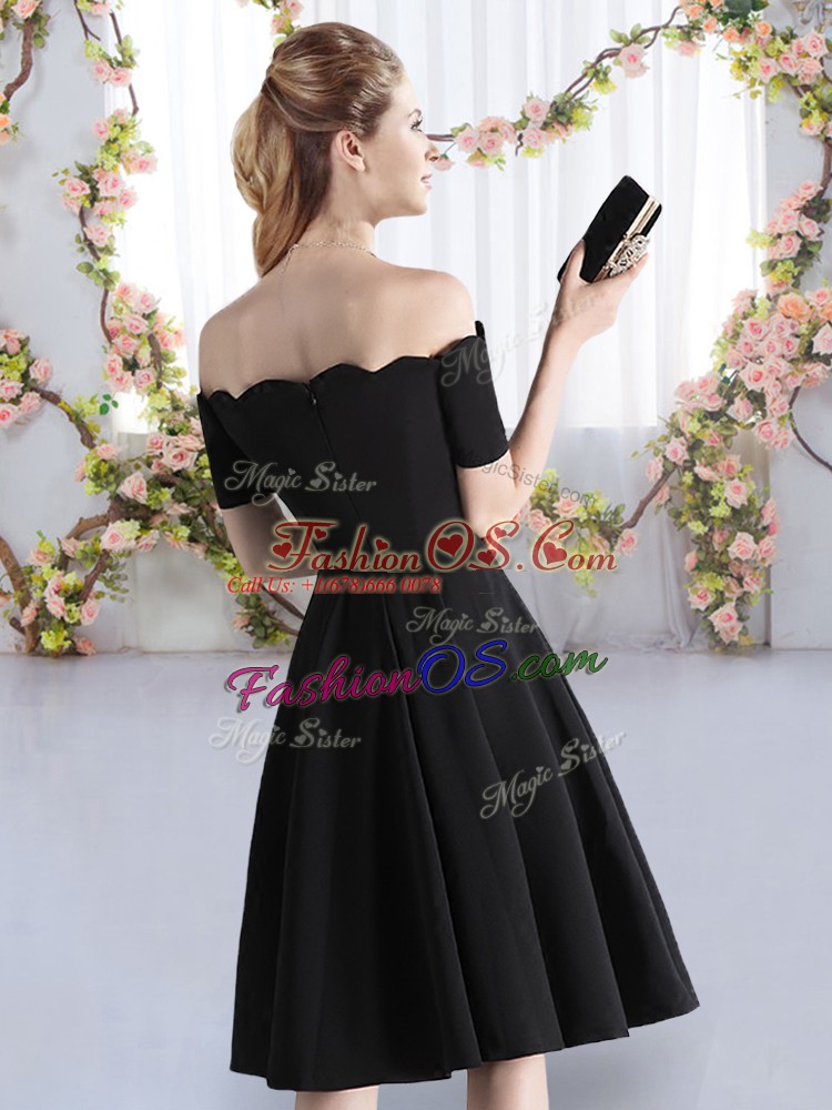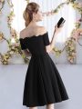 Fantastic Black A-line Satin Off The Shoulder Short Sleeves Ruching Knee Length Zipper Vestidos de Damas