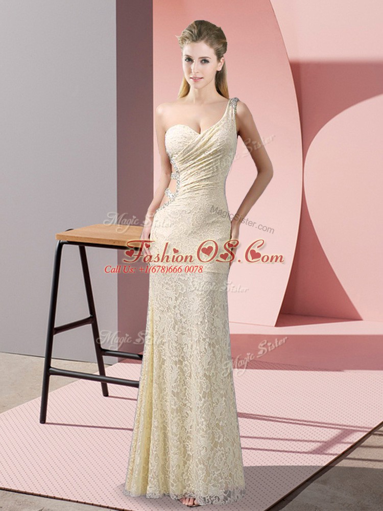 Fantastic Floor Length Criss Cross Red Carpet Gowns Champagne for Prom and Party with Beading and Lace