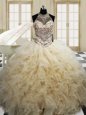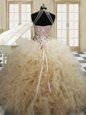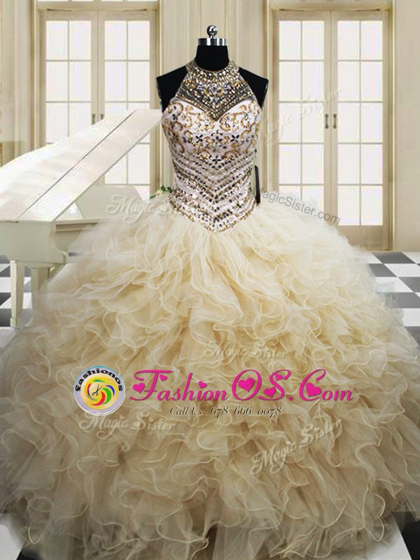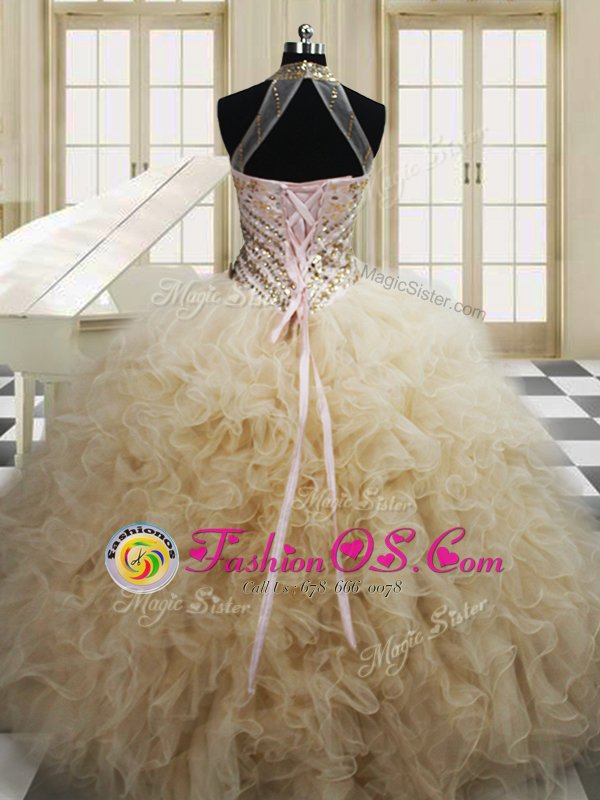 Fantastic Halter Top Champagne Lace Up 15th Birthday Dress Beading and Ruffles Sleeveless Floor Length