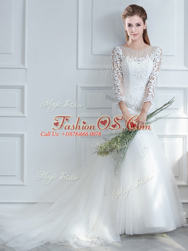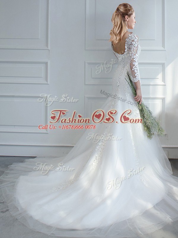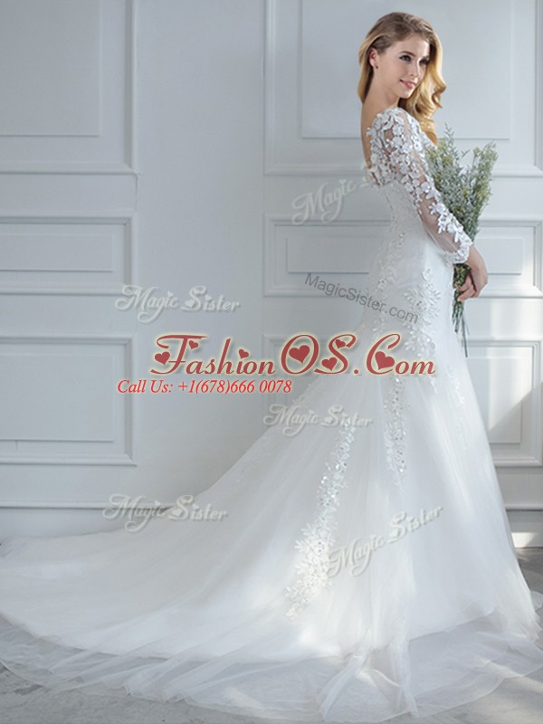 Fantastic Mermaid Long Sleeves White Wedding Gowns Court Train Lace Up