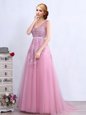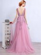 Home >  Prom Dresses >  Sexy Prom Dresses > Fantastic Pink Empire V-neck Sleeveless Tulle With Brush Train Backless Appliques and Belt Prom Dress