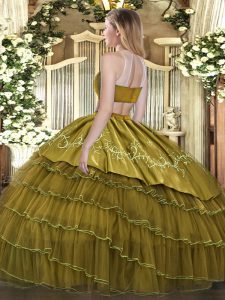 Fantastic Purple Two Pieces Tulle High-neck Sleeveless Beading and Embroidery and Ruffled Layers Floor Length Backless Quinceanera Gowns