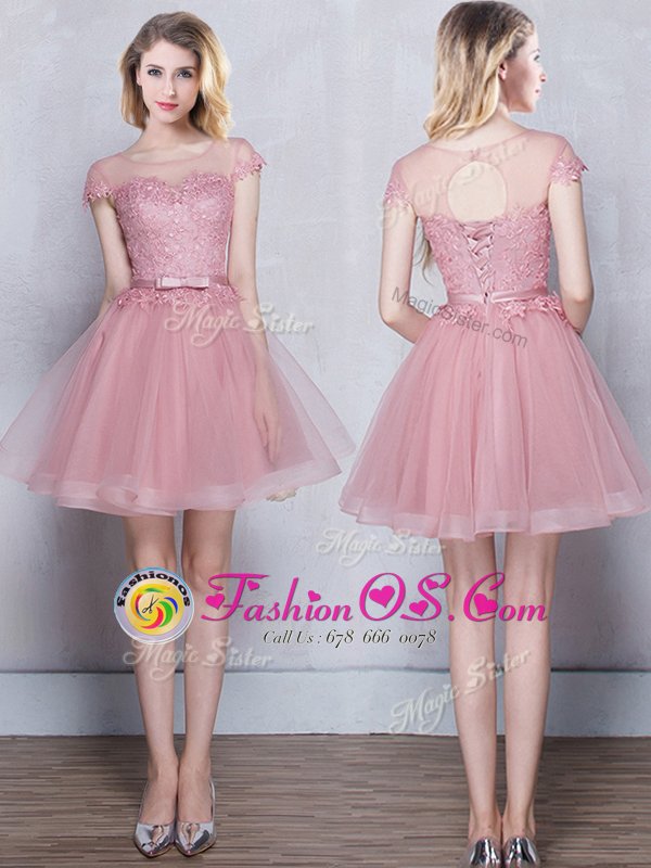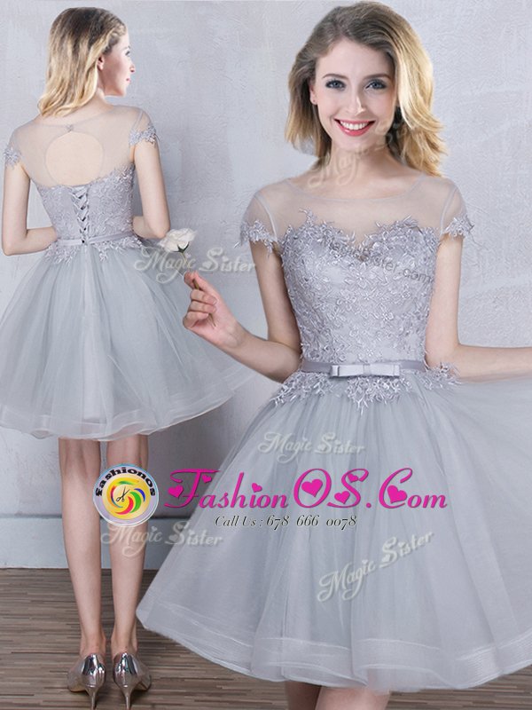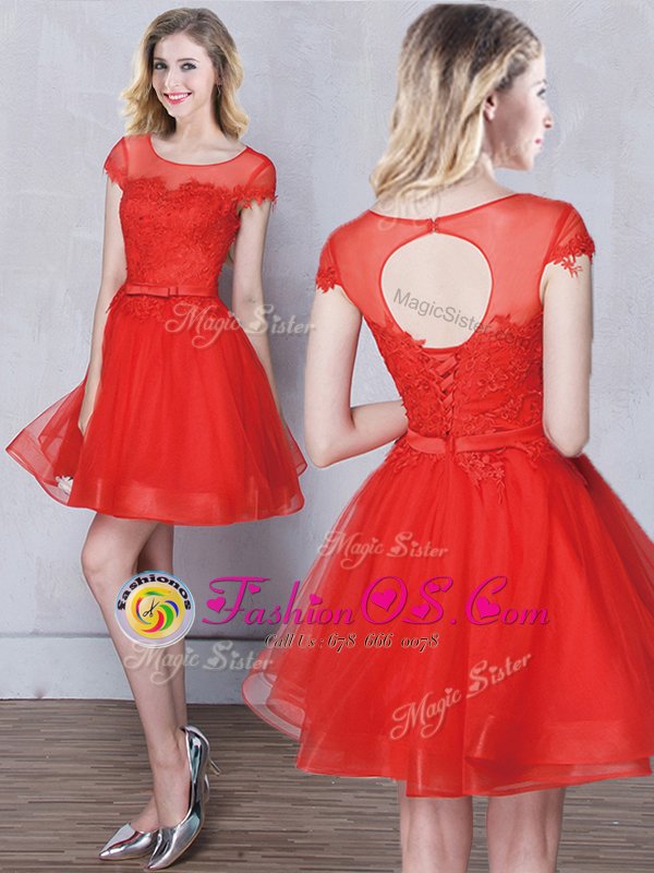 Fantastic Red and Pink and Grey Lace Up Scoop Appliques and Belt Damas Dress Tulle Short Sleeves