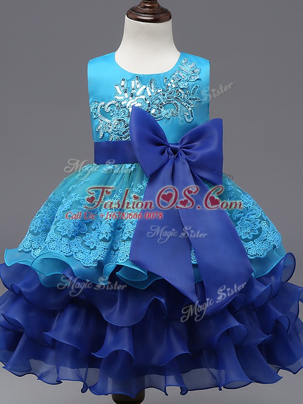 Fantastic Royal Blue Ball Gowns Lace and Ruffled Layers and Bowknot Kids Formal Wear Zipper Organza Sleeveless Tea Length
